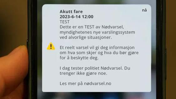 14. januar testes det nasjonale nødvarselsystemet 14 januar klokken 12.00 ringer det i alle telefoner og i varslingssystemet til Sivilforsvaret. Ikke frykt, det er bare en test. Publisert 13.01.2026 kl. 11.59