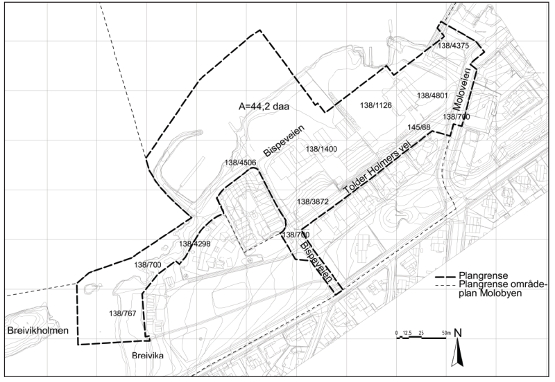 Planområdet omfatter felt BS 1, 4, 5 og 6 i områderegulering for Molobyen. I tillegg er det medtatt areal for tilgrensende gater og torg og for å sikre sti langs sjøen til Breivika, iht rekkefølgekrav i områdeplanen. Planens endelige avgrensning vil bli avklart som en del av planarbeidet. Tiltakshaver er Molobyen Utvikling AS (BS6 utvikles av Christian Jakhelln AS).