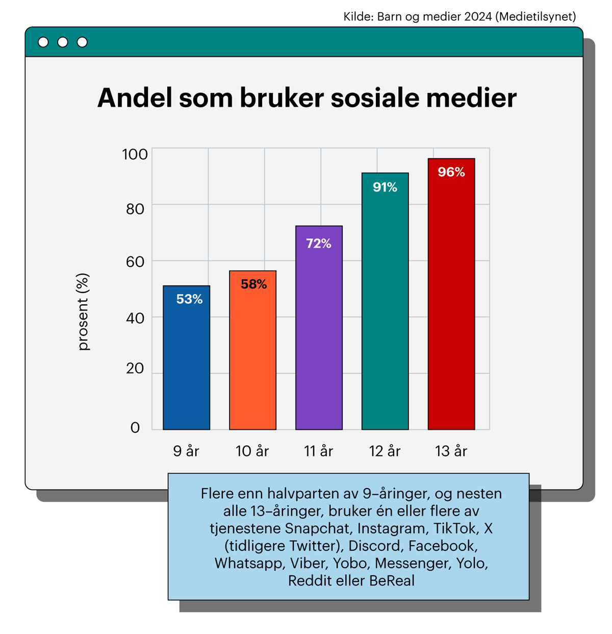 I følge Medietilsynets undersøkelse Barn og medier 2024 bruker sju av ti 9-12-åringer i Norge sosiale medier, selv om aldersgrensen er 13 år.