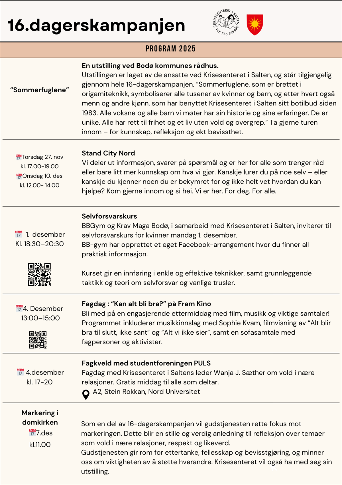 Som en del av 16-dagerskampanjen vil gudstjenesten rette fokus mot markeringen. Dette blir en stille og verdig anledning til refleksjon over temaer som vold i nære relasjoner, respekt og likeverd.