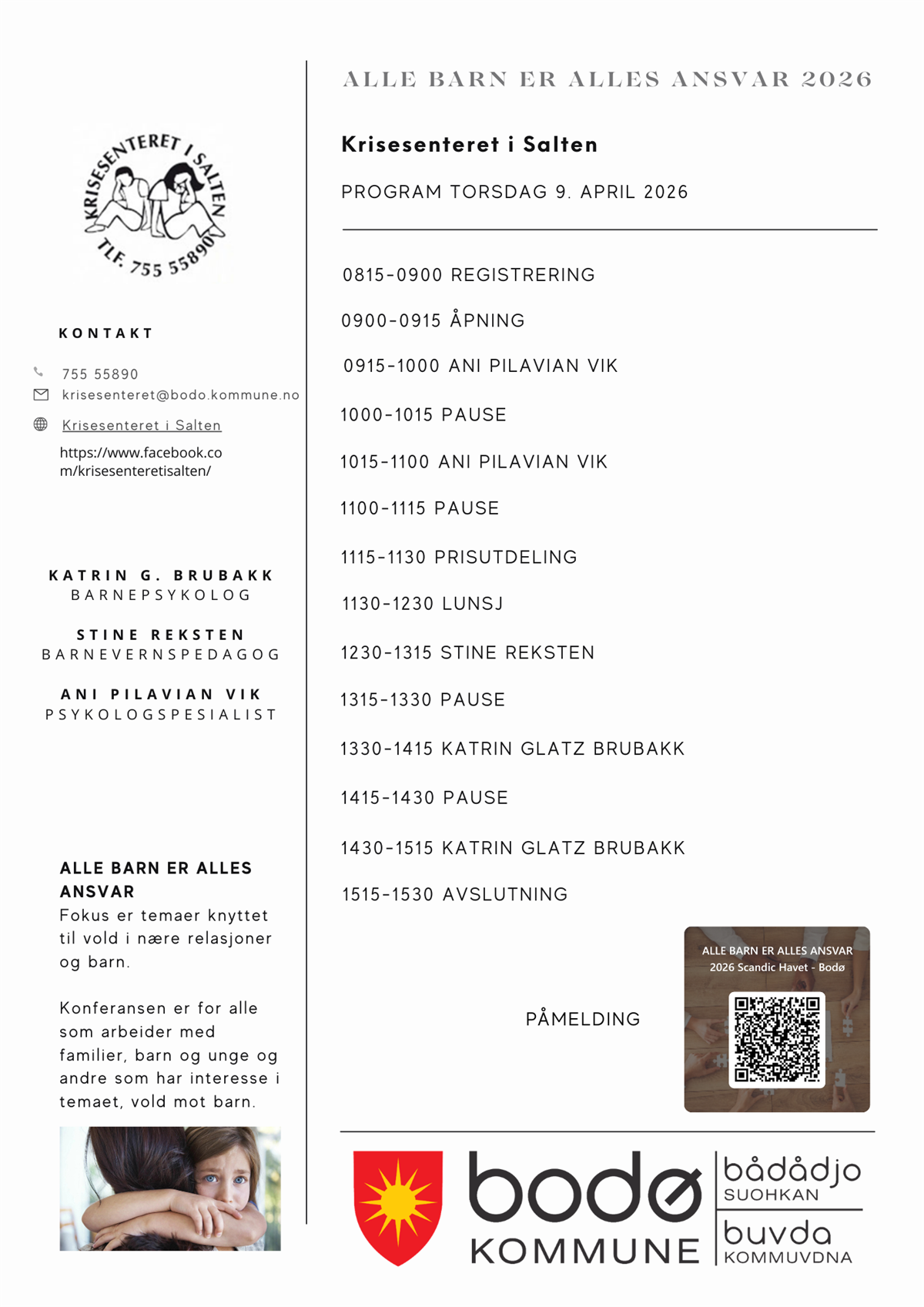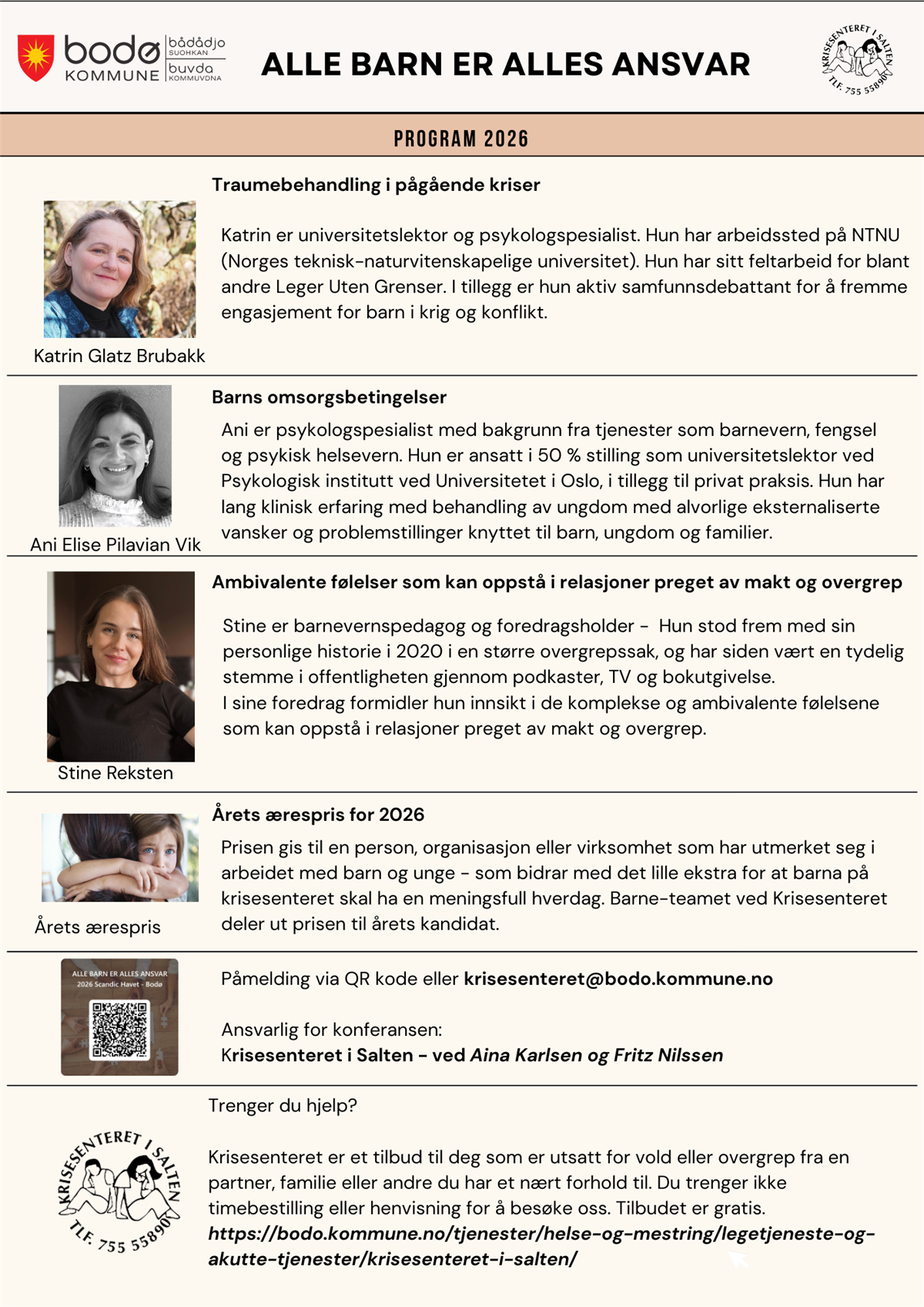 - Katrin Glatz Brubakk - (Barnepsykolog, Universitetslektor NTNU, feltarbeider for Leger Uten Grenser), hun snakker om “traumebehandling i pågående krise”.