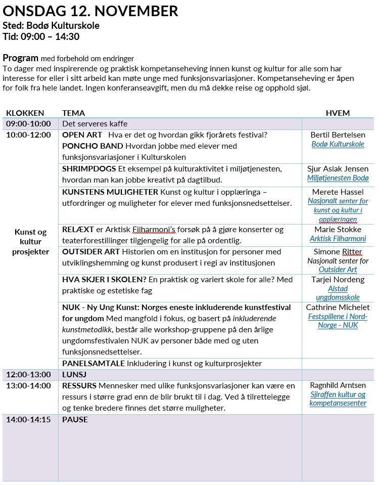 Nytt i år er at festivalen starter med kompetanseheving 12.-13. november gjennom inspirasjonsforedrag og praktiske verksteder for alle som er interessert i å jobbe med, eller holder på kulturaktivitet eller tilrettelegging innen dans, drama, musikk eller visuell kunst, rettet mot mennesker med nedsatt funksjonsevne. Her har du også mulighet til å treffe andre hvis du har lyst å diskutere “hvorfor og hvordan”.