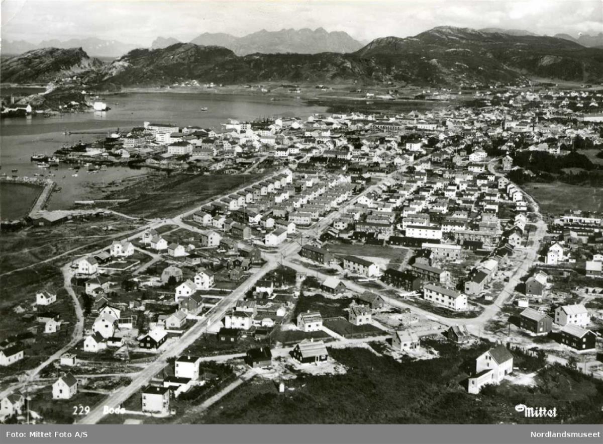 Flyfoto som viser Vestbyen og Svenskebyen i Bodø. Bildet er tatt mellom 1950 og 1960. Bildet er brukt med tillatelse.